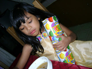 This was taken at home after she spent the rest of the afternoon swimming! All wiped out after her swimming party. Having her soup and holding one of her gifts. She is getting ready to rip those gift wrappers off!