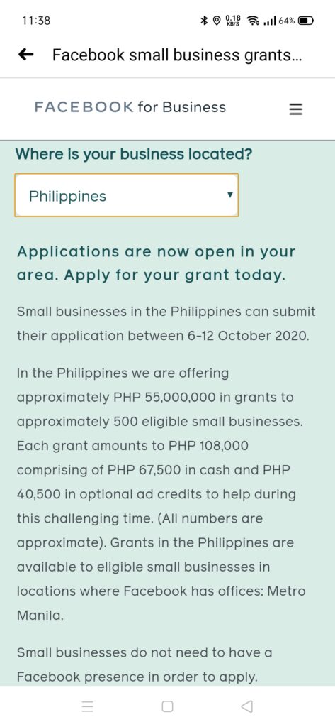 Small Businesses will have a chance to receive a grant worth Php108,000 and don’t have to be on Facebook to avail of this funding !